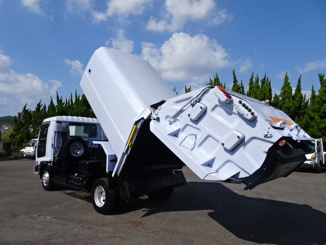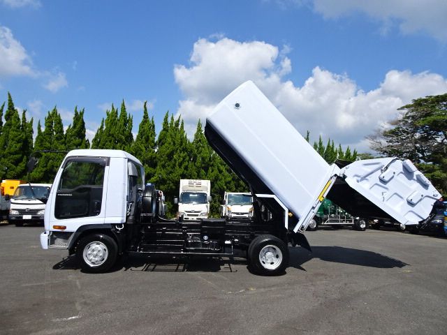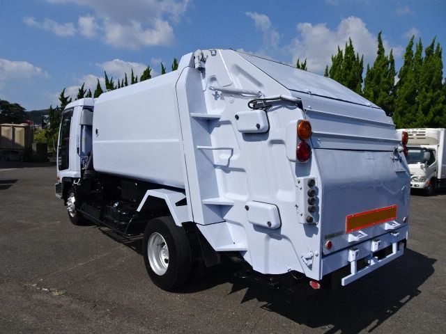 2.5t Loaded Packer 8.0m3 The exterior has scratches, rust, dents and brushed paint. Cargo bed has uneven color. Sign has been erased. Light lenses are cloudy for the model year. Tailgate right catch lever is broken. The interior is a little dirty, but in good condition.