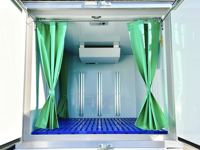 Low-temperature refrigerated truck, -30°C, Ryoju Cold Chain 2 Compressor, 7-inch Carry, 4-speed automatic transmission, single-side sliding door, rear lock rod door, obstacle sensor, keyless operation, passenger airbag, left and right 90-degree stopper, cooling curtain
