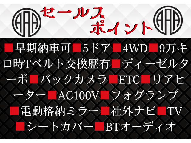 ■Early Delivery Available■5 Door■4WD■Timing Belt Replacement History at 90,000 Kilometers■Diesel Turbo■Back-Up Camera■ETC■Rear Heater■AC100V■Fog Lights■Power Retractable Mirrors■3rd Party Navigation■TV■Seat Covers■BT Audio
